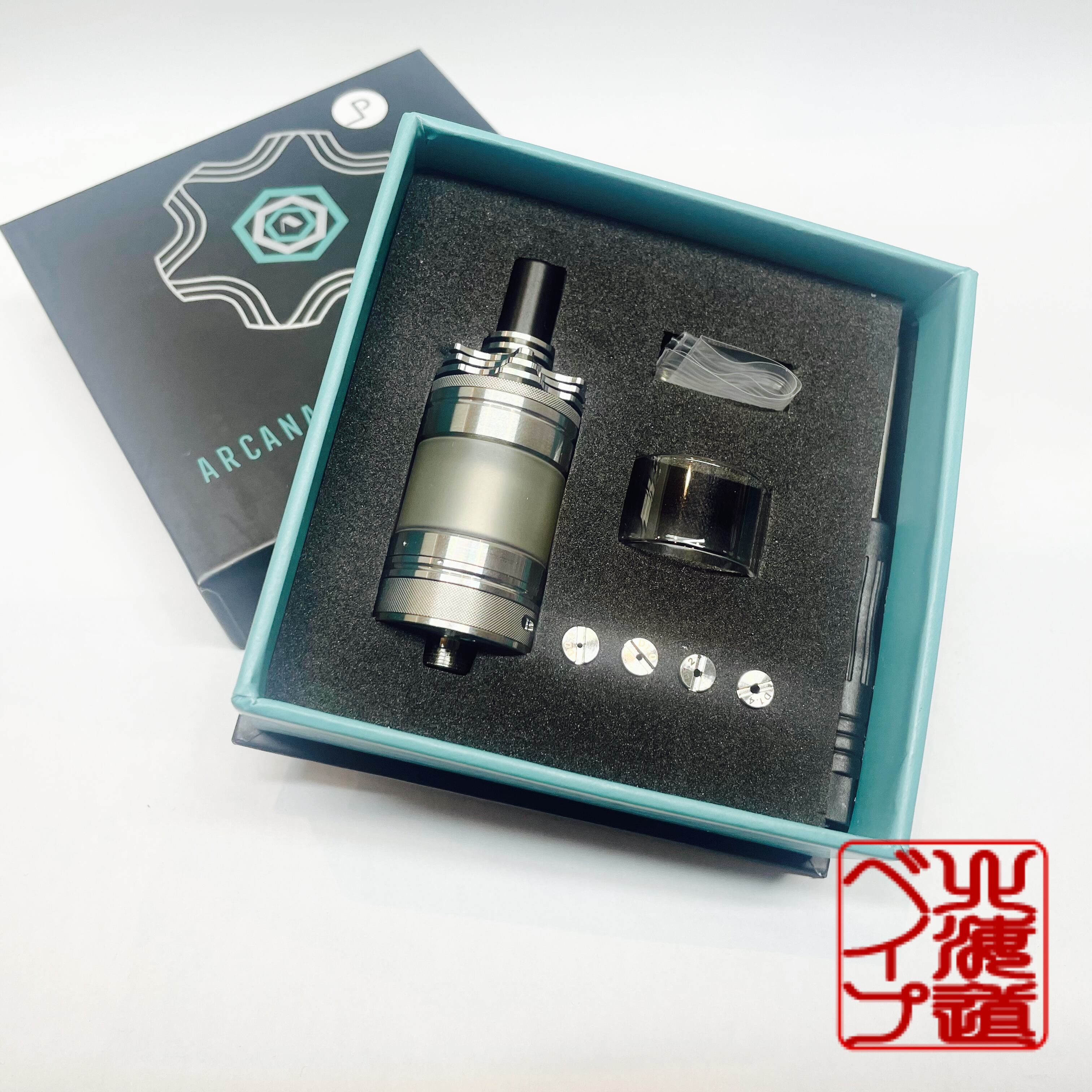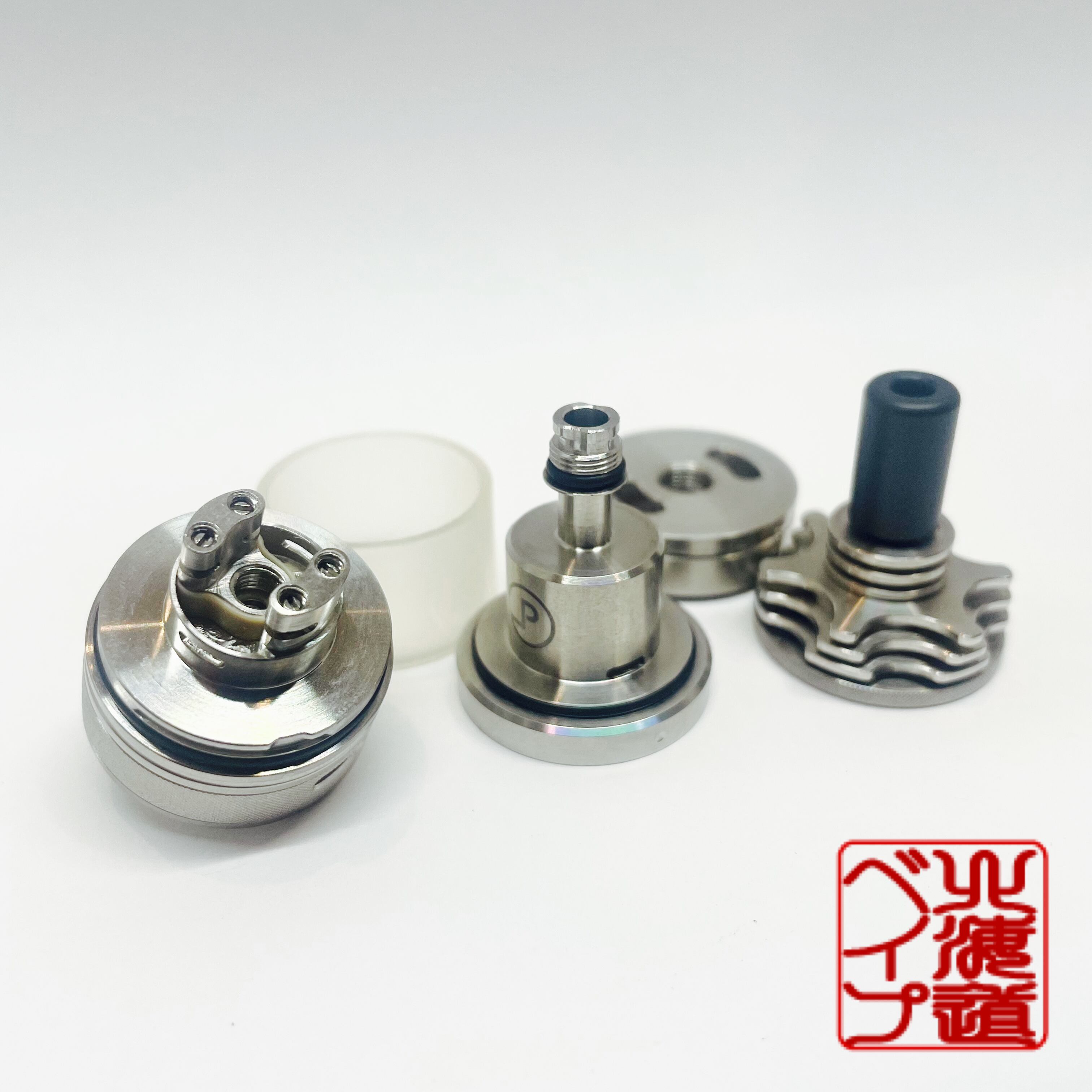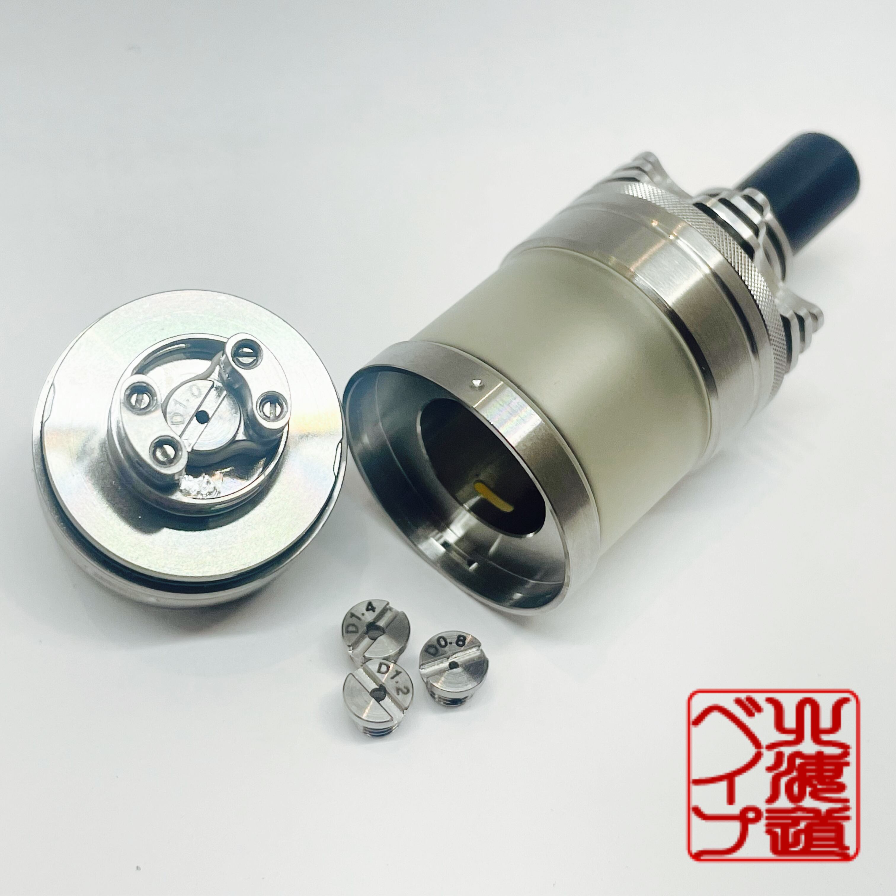 スレッドの部分がほとんどなくトップフィルの上蓋やデッキとタンクの接続部も180度ほど廻して引っ張るらくちんスタイル。エアフローは0.8㎜、1.0㎜、1.2㎜、1.4㎜から選択して取り付けるタイプに加えてエアフローリングでの調整もでき無限のドロー調整が可能です。ポジティブピンは逆ネジですので注意してください!