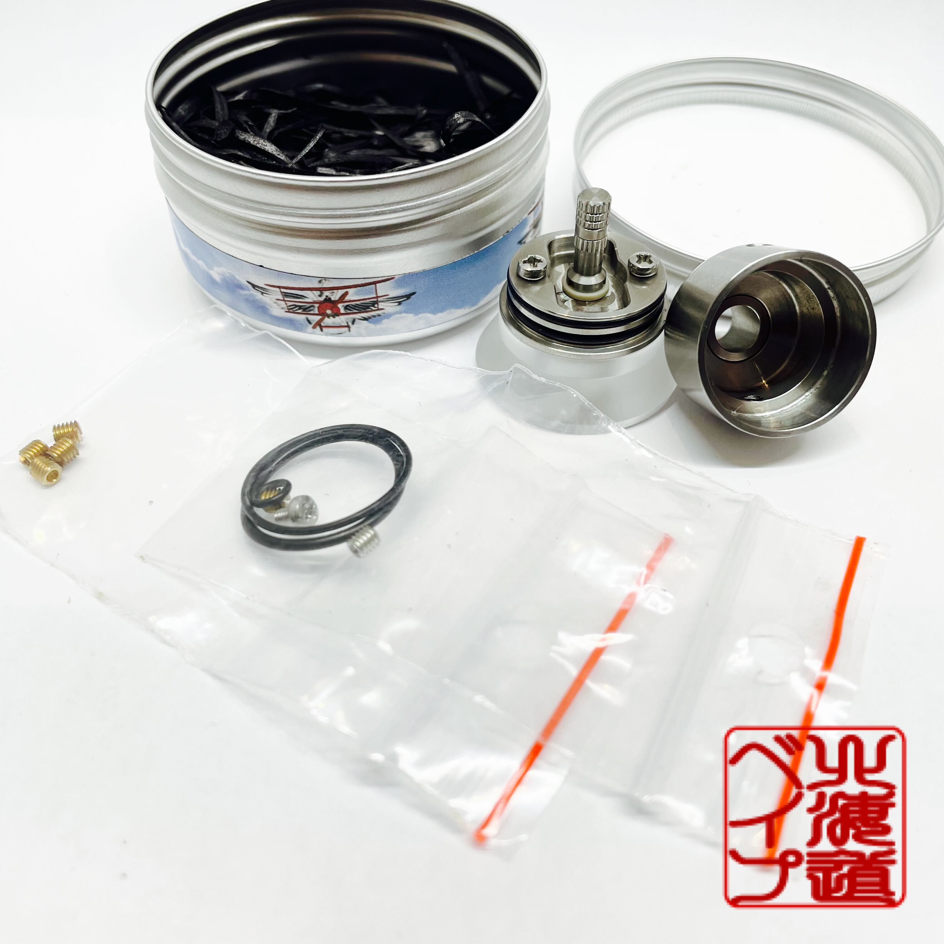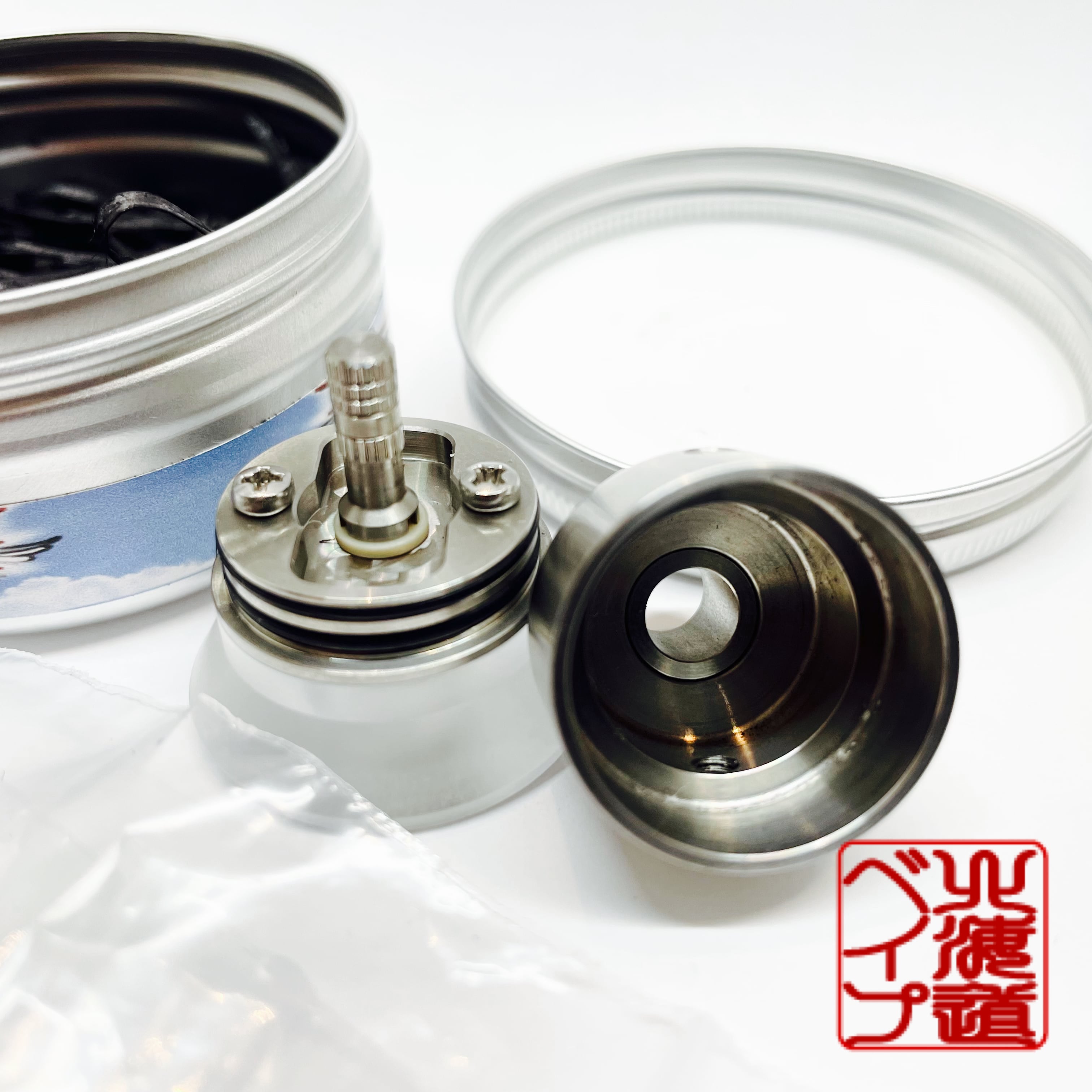 もはや名作!TjT Exclusive Creationsの大人気RDA!小さいRDAながらチャンバー内のスペースを広く使えるネガティブ側はデッキに直接留めるタイプなのでシングルコイル、デュアルコイルだけでなくコイルも横置き、縦置きと様々なビルドで楽しめます。エアフローは2カ所の穴にイモネジをねじ込み調整するタイプで1カ所の穴を塞ぐこともできますので幅広い調整が可能です。また余分なイモネジはデッキ底部に収納可能で出先でのエアフロー変更もできます。